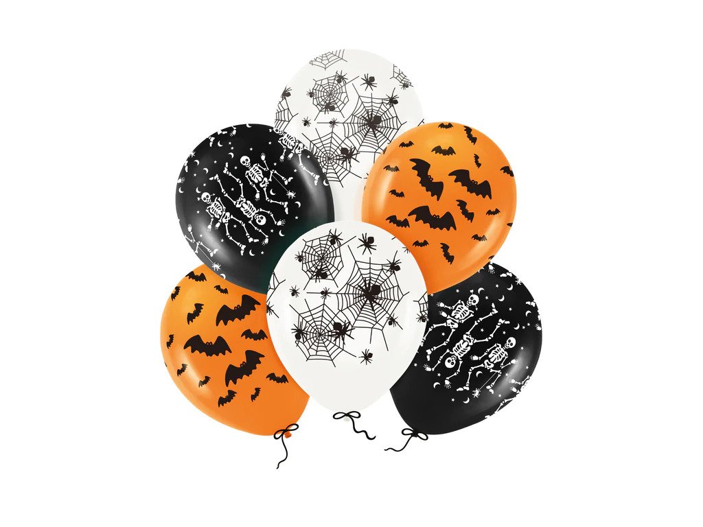 - Sada obsahuje 6 kusů latexových balónků: 2 bílé s pavouky a pavučinami, 2 oranžové s netopýry a 2 černé s tančícími kostlivci