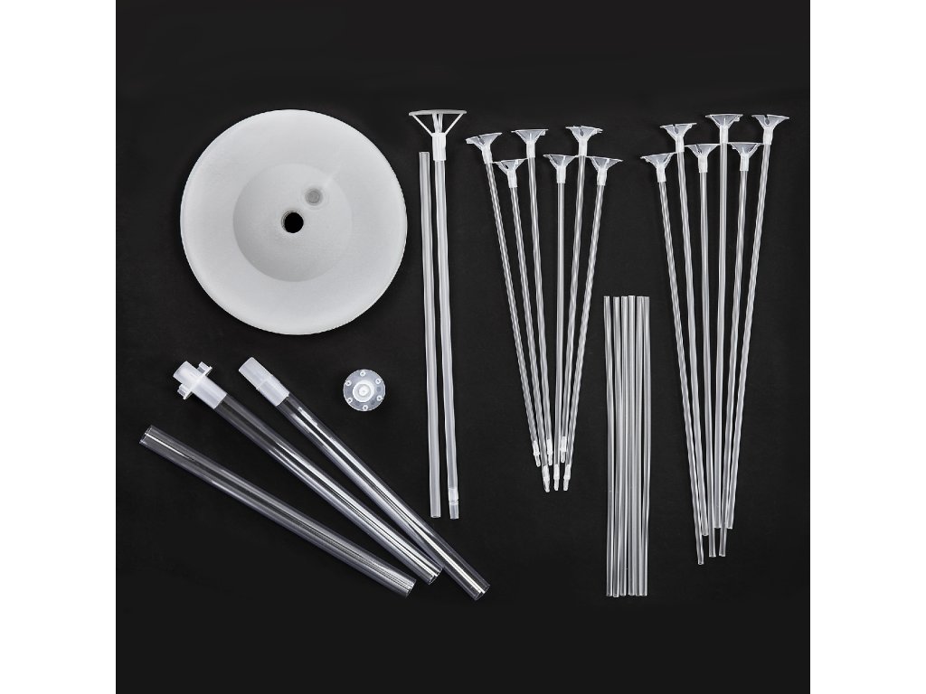 Stojan na balonky Výška: 100 cm Šířka: 19,5 cm Obsahuje: dvoudílný podstavec, 11 tyčinek různých délek (40-98 cm), 12 košíků Materiál: plast Snadná instalace Vyrobeno...